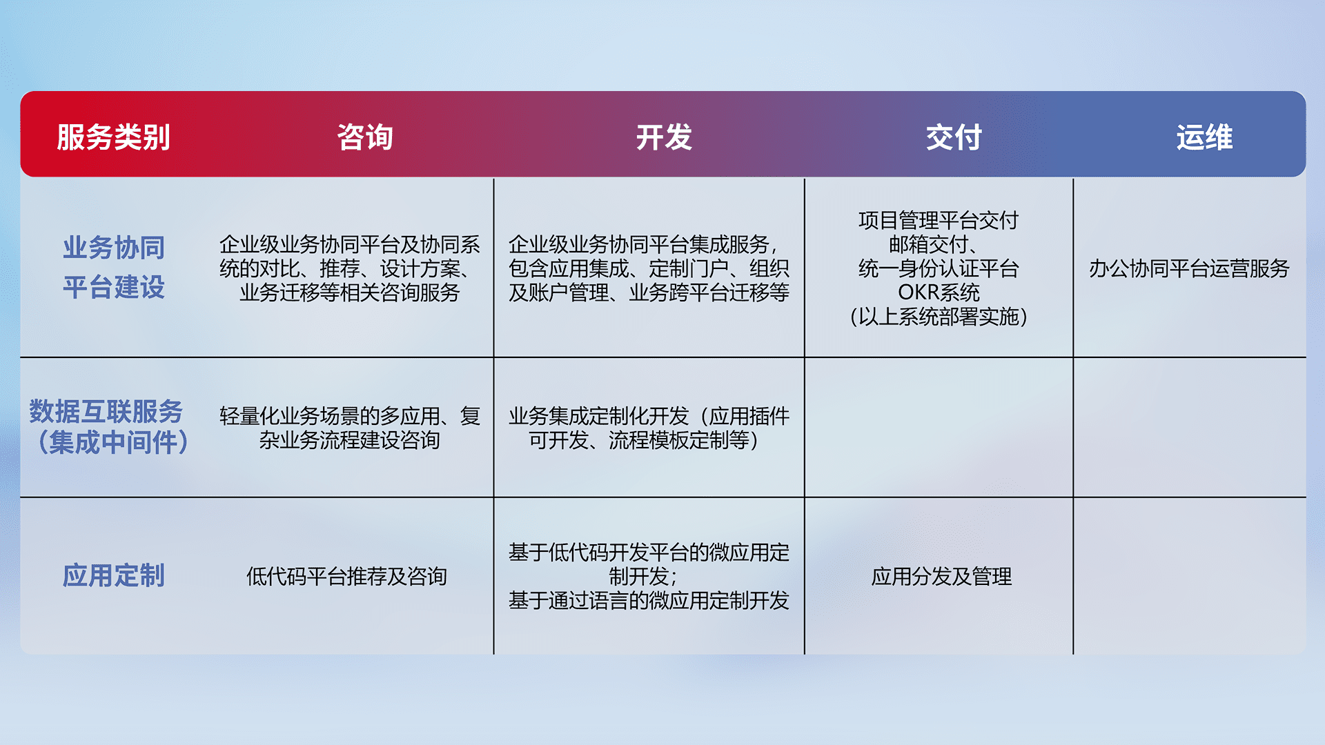 针对钉钉、、、、企微、、、、IDaas等平台级产品提供产品的规划、、方案、、交付、、定制化开发等服务,,,实现如统一协同办公、、、、智能客户服务、、、、混合会议管理、、、、智能数据查询、、等业务场景,,,实现数字化转型。。。。