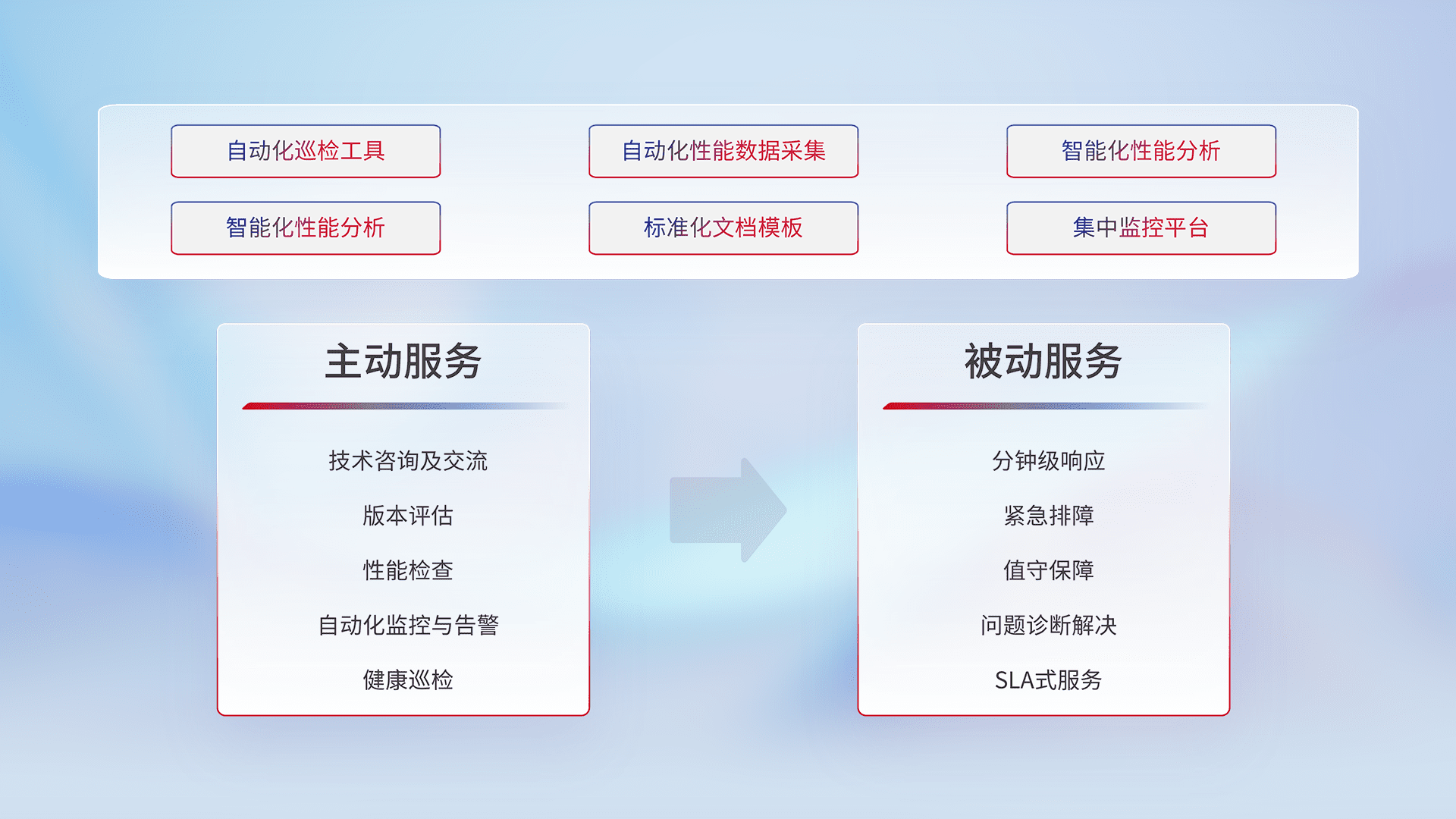 智能化工具和标准化文档,,,保障服务质量,,,,提供主动服务(包含技术咨询、、版本评估、、、、性能检查、、自动化监控与告警、、健康巡检)和被动服务包含(分钟级响应、、紧急排障、、值守保障、、问题诊断解决、、、、SLA服务)。。。。