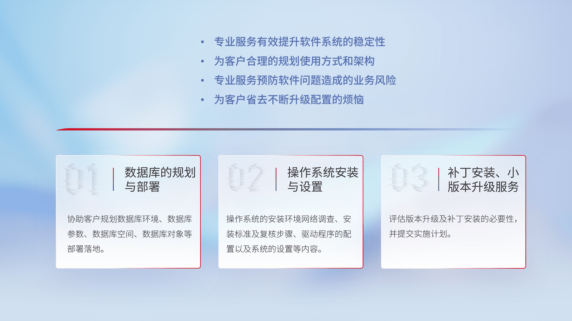 为客户提供软件规模升级、、、、快速部署、、、按需配置的专业服务,,,从数据库的规划与部署到操作系统的安装与设置,,再到补丁安装和小版本升级提供支持。。。。